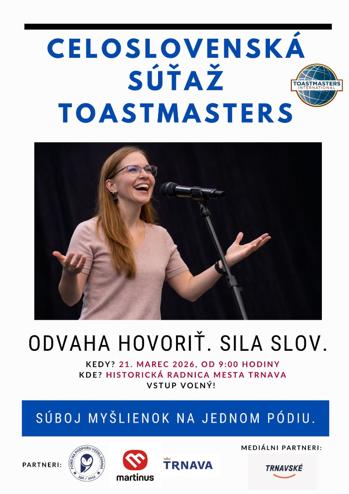Niektoré prejavy dokážu inšpirovať, iné rozosmiať – a tie najlepšie zostanú v pamäti ešte dlho po tom, čo zaznejú posledné slová. Presne takú atmosféru prinesie celoslovenská súťaž organizácie Toastmasters International, ktorá sa uskutoční 21. marca 2026 v priestoroch Historickej radnice mesta Trnava. Partnerom podujatia je aj Fond na podporu vzdelávania, ktorý dlhodobo podporuje iniciatívy zamerané na rozvoj zručností a vzdelávanie.